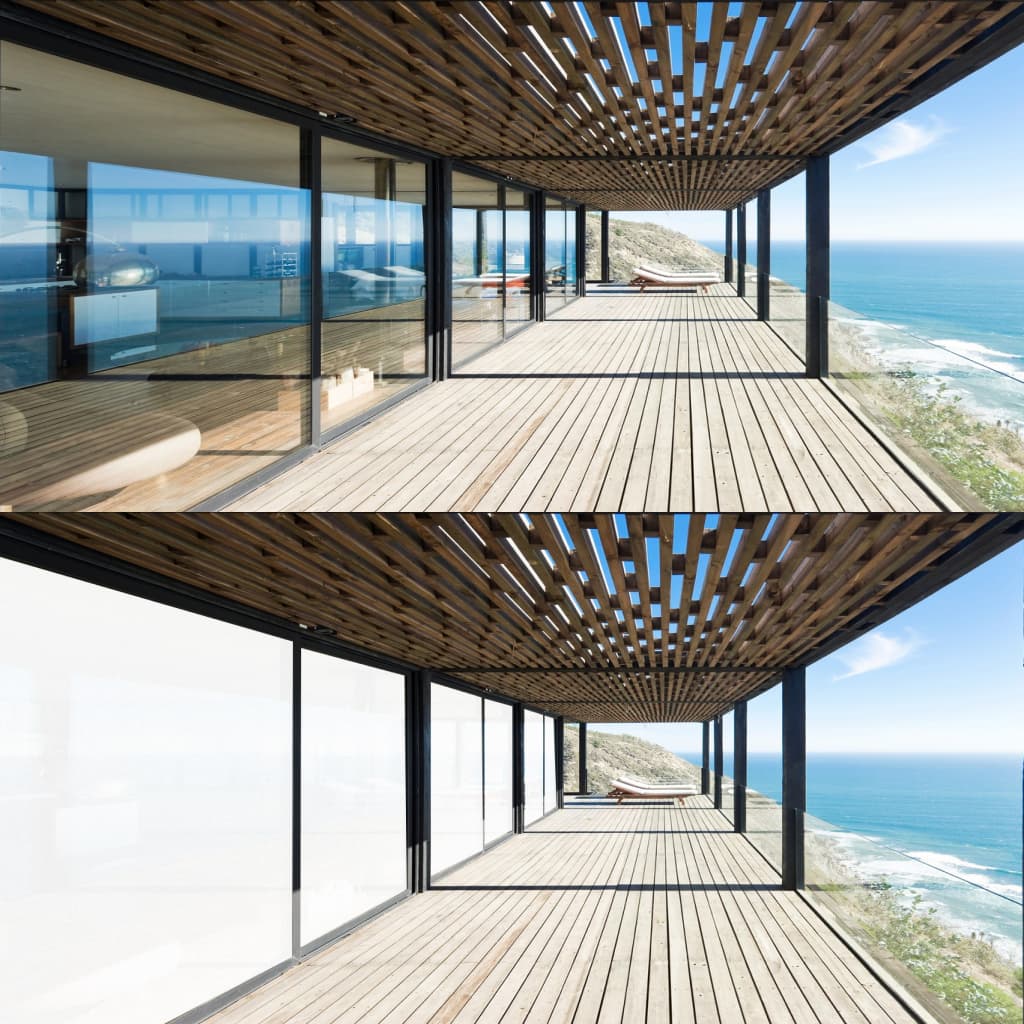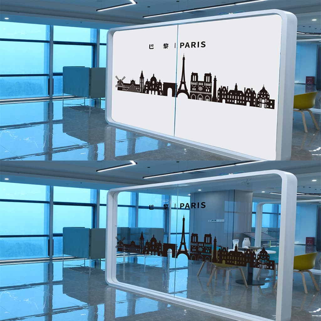 O smart film é uma película inteligente aplicada em superfícies de vidro que alterna entre modos transparente e opaco ao receber uma corrente elétrica.